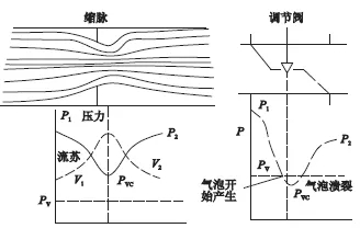 圖4 閥內流體速度-壓力變化及汽蝕形成原理