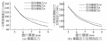 圖6 徑向槽數不同時盤片厚度對應力的影響