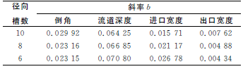 在盡量減小數值誤差影響的前提下,為比較各參數對流量的影響程度,采用最小二乘法對各曲線進行線性擬合,得到各擬合曲線的斜率b值,見表2。通過比較斜率b值的大小,就可得出各參數在其變化范圍內對流動的影響程度。由表2可知,在各參數的變化范圍內,流道深度對流量的影響最大,進口寬度和倒角次之,出口寬度最小。