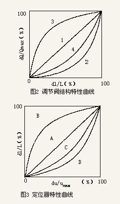 在沒(méi)安裝定位器的情況下,K1為一常數(shù)即閥行程與到閥控制信號(hào)成線性關(guān)系,此時(shí)調(diào)節(jié)閥的靜態(tài)特性即為其結(jié)構(gòu)特性,無(wú)法改變;如果安裝了定位器,則K1即為定位器的性能特性。對(duì)于機(jī)械力平衡式定位器來(lái)說(shuō)可以通過(guò)更換反饋凸輪來(lái)加以改變,而對(duì)于智能型定位器由于預(yù)先進(jìn)行了程序設(shè)置,因此只需要通過(guò)功能鍵進(jìn)行選擇就可以任意改變K1,從而改變調(diào)節(jié)閥的靜態(tài)特性。當(dāng)現(xiàn)有調(diào)節(jié)閥的流量特性符合需要時(shí),只需將定位器特性設(shè)置為線性。