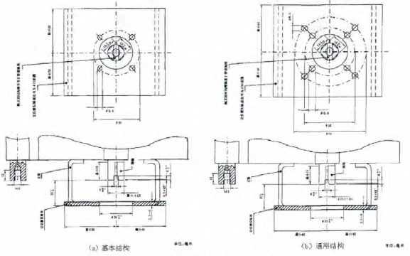 IEC60534-6-2《工業過程控制閥第6-2部分定位器與控制閥執行機構連接的安裝細節定位器在角行程執行機構上的安裝》,適用于角行程執行機構,其基本結構和通用結構的規范尺寸見圖2、圖3、圖4。