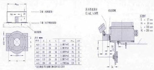 SAMSON執行機構品種規格齊全,其中既有同時提供符合IEC60534-6-1的鑄造支架側面凸緣接口和符合VDI/VDE3847直接集成接口的3277型氣動執行器(具有符合VDI/VDE3847的直接集成連接的執行機構由于規范的支架尺寸和內置氣路等原因,膜室尺寸受到結構限制,3277型膜片有效面積最大到700cm,2共有6種尺寸);也有從120到2*2800cm有效面積、結構為符合IEC60534-6-1鑄造支架側面凸緣的3271型氣動執行器(有7種尺寸),對角行程執行機構符合VDI/VDE3845,連接細節參見圖5。