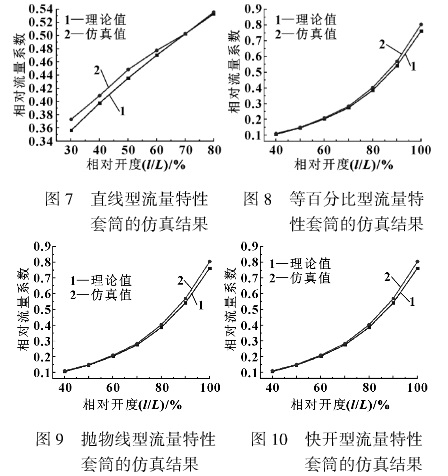 (卻△p= 0. 1 MPa)的環境中得到。小開度時因內部結構產生的較大阻力對理想流量特性的影響,為驗證工作流量特性隨著閥門開度的變化是否滿足設計要求,檢測偏離程度的影響,采用FLUENT軟件仿真驗證套筒窗口形狀設計。