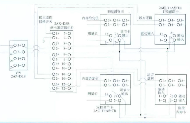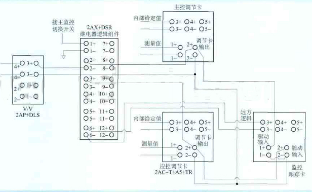 正常情況系統(tǒng)在主控模式下運行。此時,2+、2-為常閉觸點,3+、2-為常開觸點,6端為低電平時,觸發(fā)應控跟蹤卡工作。應控跟蹤卡的輸入引自繼電器邏輯組件2-端,輸出到3+端,使得2+端和3+端電位相同,實現(xiàn)跟蹤主控調節(jié)卡的功能。